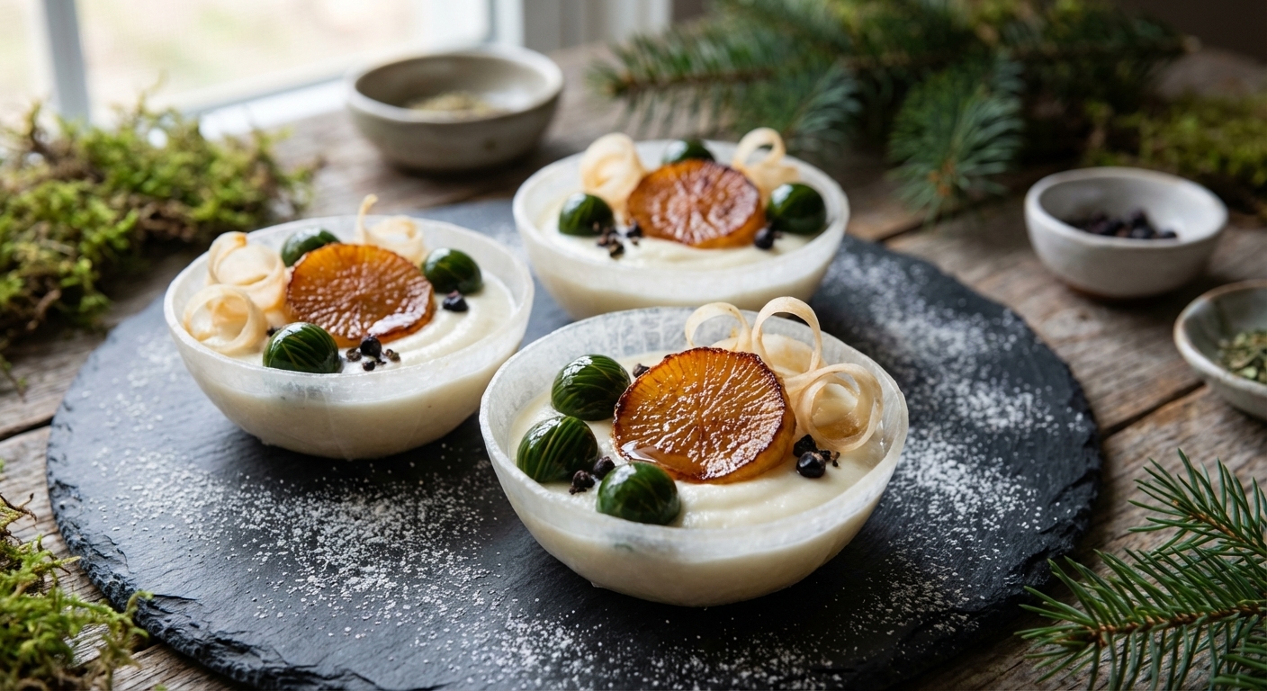 这份甜品是时间与自然的宏大叙事,是对海岩上被岁月雕琢的琥珀的味觉致敬。白萝卜,以其纯粹与内敛,通过海带高汤和威士忌的浸润,化作晶莹剔透的“琥珀晶柱”,承载着海洋的咸鲜、洋甘菊的微苦芬芳。轻盈的“潮汐雾霭”如海风般拂过,散发着海苔、香菇与威士忌的复杂香气,极微量的烟熏辣椒粉暗藏一丝出人意料的微辣维度,激发出味蕾的深层共鸣。焦糖与可可碎编织成的“浪花脆片”,则在甜咸与苦涩的博弈中,带来海洋拍打礁石般的酥脆回响。这份菜品的核心在于白萝卜的极致解构与重构:通过“真空快速压浸”在富含谷氨酸的海带高汤和威士忌中浸渍,使其细胞结构发生微观变化,变得脆嫩而富有弹性,同时吸收海带的鲜味与威士忌的酯类芳香。经“不锈钢漏勺极速闪焯”锁住风味与质地。萝卜汁与低比例琼脂凝结成晶莹剔透的“晶柱”,具“建筑结构感”,通过“双重温度冲击凝胶”和冰镇模具实现瞬时固化。风味科学上,海带谷氨酸与萝卜醛类/酯类形成分子桥梁,威士忌酚类/酯类渗透,提升鲜味与香气深度;同时,引入海带谷氨酸、香菇鸟苷酸,实现强大鲜味协同,洋甘菊与威士忌、海苔形成分子共鸣,可可碎、烟熏辣椒粉精准引入苦味与微辣,构建多维风味图谱。技术创新点在于“旧工具新灵魂”的极致运用:漏勺闪焯、打蛋器双温凝胶、竹筷搭模塑形、筷子拉花、茶漏散布泡沫,技法创新且不炫技,富有艺术性。上菜时,它更是一场精心编排的感官剧场。从静默的玄武岩盘到热蜜露的香气引爆,从干冰烟雾的缥缈涌动到泡沫轻拂的沙沙作响,每一次触觉、嗅觉、听觉的刺激,都将食客瞬间拉入一个雾霭弥漫、潮汐低语的海边场景。视觉上,玄武岩盘、建筑结构晶柱、焦糖浪花、动态烟雾、冰火蜜露、泡沫轻拂等设计,完美实现视觉焦点、口感反差。听觉上,热蜜露划过盘沿发出“咻——”的轻柔破空声,干冰浇水“滋啦”一声,泡沫洒落茶漏中“沙沙作响”与“簌簌飘落”,营造沉浸式听觉剧场。嗅觉上,从热花蜜露瞬间引爆的温暖馥郁洋甘菊花香,到海苔香菇威士忌雾霭飘散的深邃海潮与烟熏气息,再到干冰烟雾带来的真实海洋气息,嗅觉被多层次香气环绕,沉浸于海边梦境。触觉上,食客先体验“浪花脆片”的极致酥脆,口中瞬间瓦解,发出“咔嚓”声。随后是“琥珀晶柱”的脆嫩弹性,清甜与鲜香交织。最后,“潮汐雾霭”的冰冷、轻柔在舌尖瞬时消融,带来浓郁鲜味与微辣,留下持久记忆。味觉上,焦糖甜、海盐咸、可可苦、洋甘菊蜜露酸甜发酵、琥珀晶柱清甜鲜香、潮汐雾霭复合鲜苦咸与微辣,各种风味此起彼伏,上演扣人心弦的“甜咸苦微辣博弈”,提供独立而完整的味觉旅程。