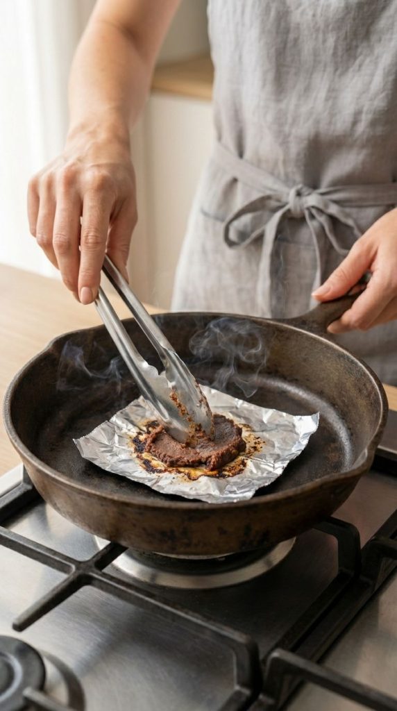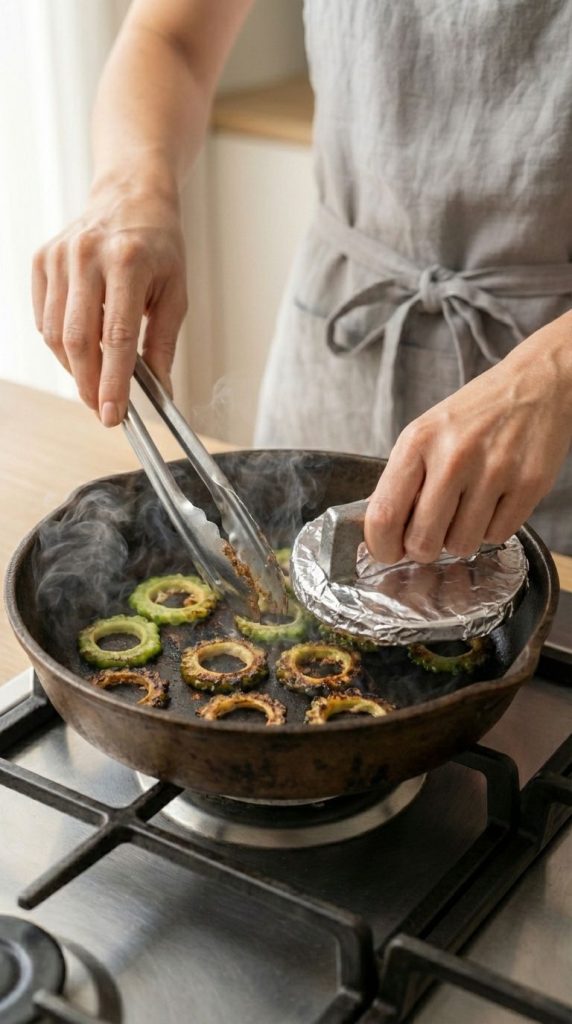 3. 【极温压烤】:将铸铁平底锅加热至200°C(微冒青烟),铺入苦瓜片,上方压上一个底部平整且包裹了铝箔的重锅或压肉板。保持中大火压烤45-60秒,直至苦瓜水分蒸发并呈现深褐色焦痕。