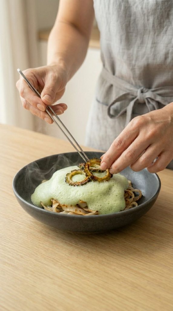 一道融合泰式发酵美学与现代乳化工艺的米其林级苦瓜料理。利用碱性焦糖化与温态氧气泡沫,在30分钟内重塑苦瓜的灵魂。