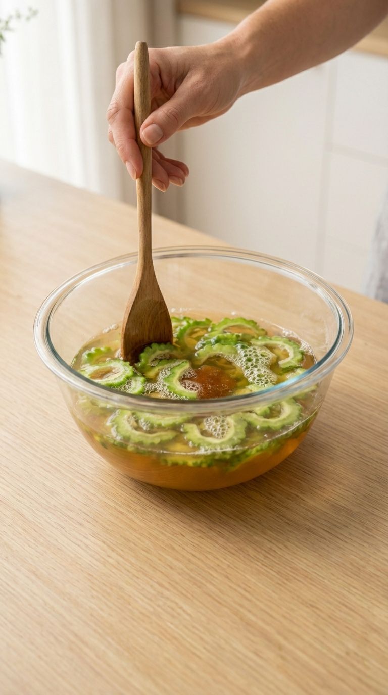 2. 【碱性腌制】:将“余烬组”1.5mm苦瓜薄片浸入由青苹果汁、棕榈糖和小苏打组成的溶液中,静置5分钟以改变表面pH值。