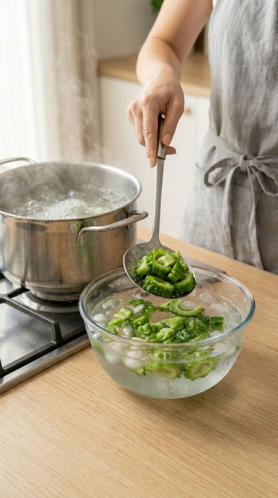 4. 【杀青固色】:将“翠绿组”苦瓜去瓤,在加了2g盐的1000ml沸水中快速焯水30秒,立即投入含有100g冰块的200ml冰水中镇凉,沥干备用。