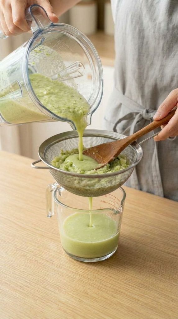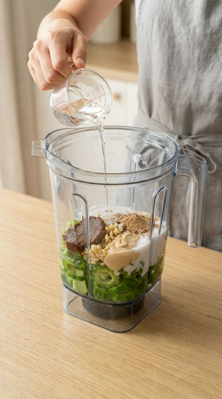 5. 【分子乳化】:将焯水后的“翠绿组”苦瓜、炙烤虾膏、南姜末、腰果酱、椰浆、香菇粉放入破壁机,加入50ml约50°C的温水,高速打碎1分钟。