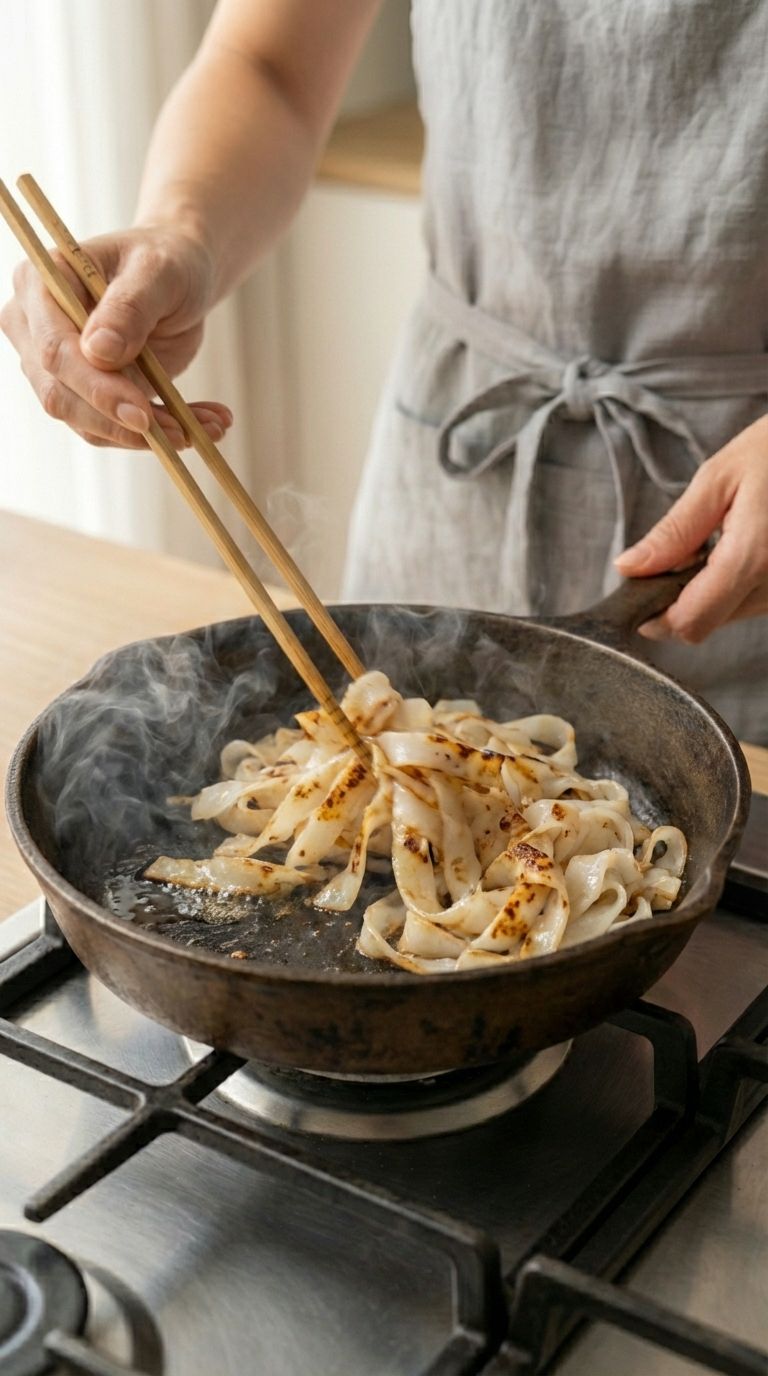 7. 【干炙米粉】:在极热铸铁锅中抹薄油,投入彻底吸干水分的米粉。用竹筷在大火上快速拨弄约2分钟,利用高温在米粉表面制造出焦脆斑点(镬气)。