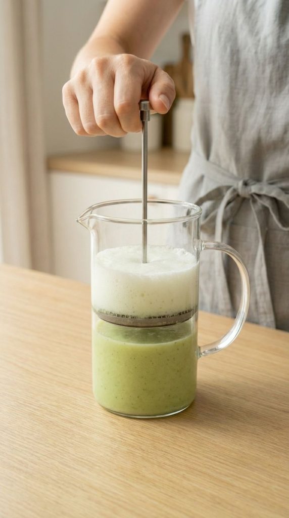 8. 【温态泡沫】:在法式滤压壶中快速抽拉20-30次,利用腰果油脂捕捉空气,制造出丝滑的“温态苦瓜氧气云朵”。