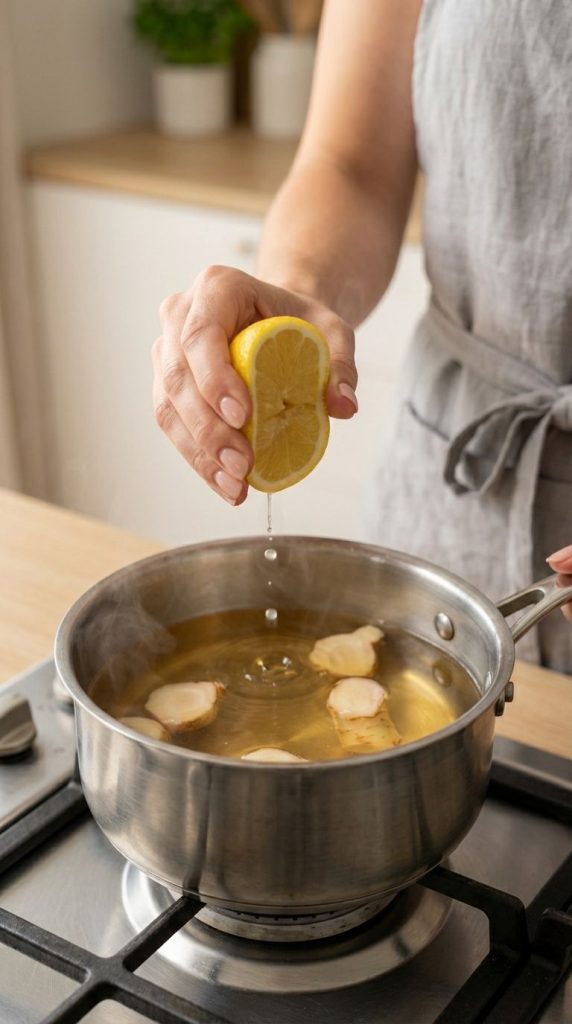 9. 【芳香萃取】:将清酒、茉莉花茶、南姜片混合加热至90°C(微沸即关火),滴入柠檬汁,保持热度。