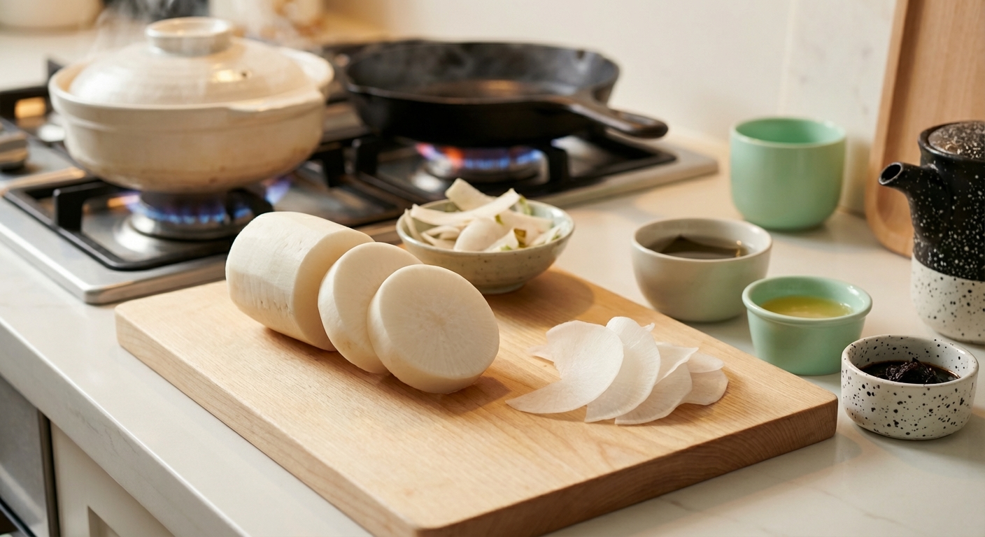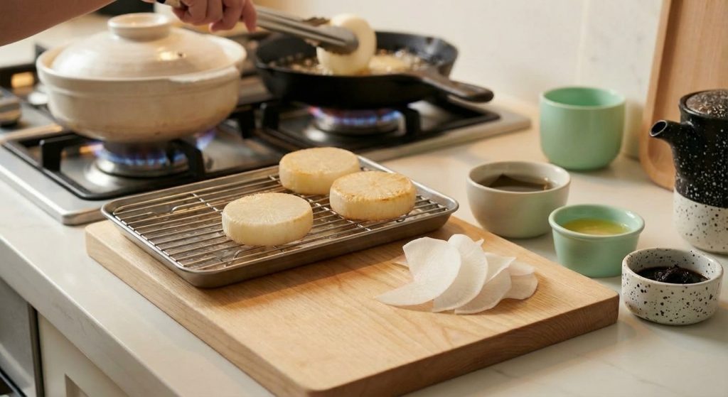 2. 在一个小而深的锅中加热中性油至180°C。将3块白萝卜厚片迅速浸炸10-15秒,至表皮微焦黄,迅速取出沥油,此为“高温油浴急变”。