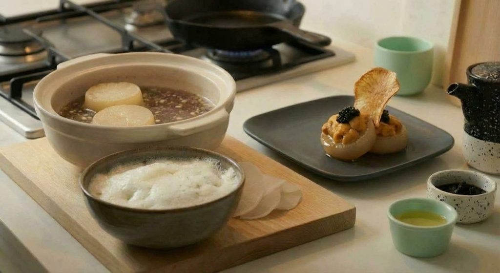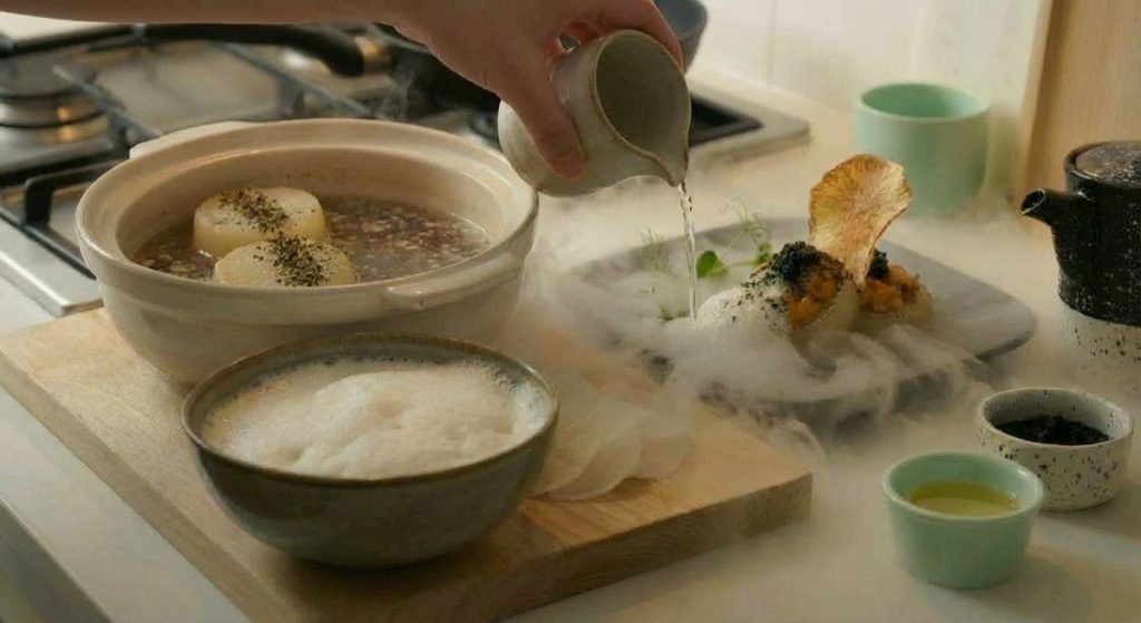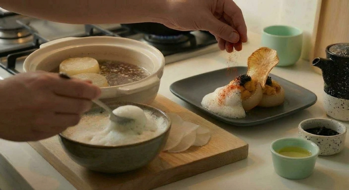 通过“高温油浴急变”和“砂锅蓄热回旋”技法,在瞬间激发白萝卜根魂深处的焦糖化与旨味,模拟大地深藏的醇厚与熟成风味。发酵黑蒜酱的加入,如同将土壤的秘密低语融入其中,与白萝卜的硫化物和海胆的海洋鲜味构建起深刻的分子桥梁。