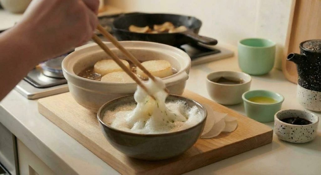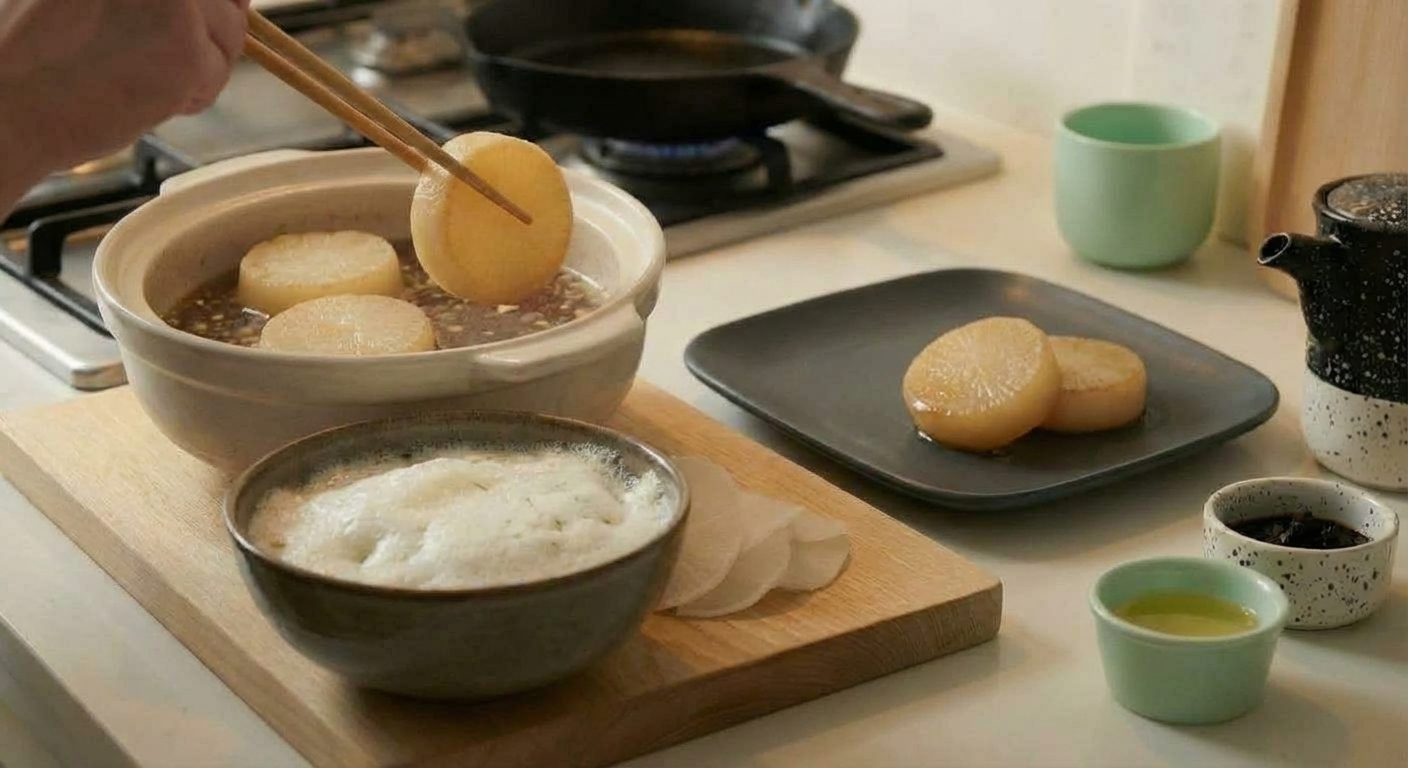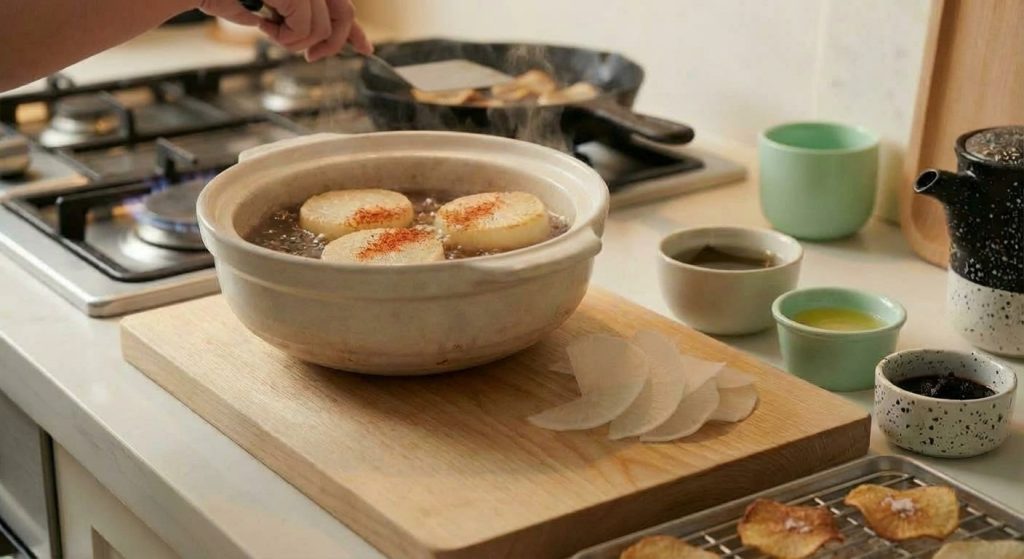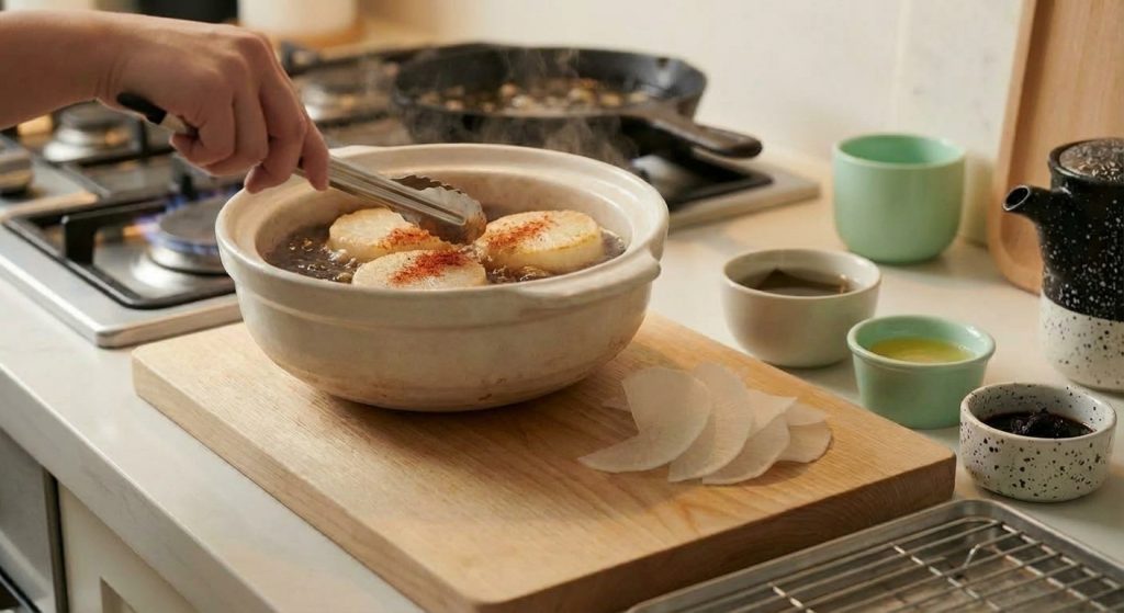 3. 将预热至极高的迷你砂锅置于小火上。倒入100ml昆布水、20g白味噌、5ml柚子汁、5g发酵黑蒜酱,搅匀。放入油浴后的萝卜厚片,撒1g烟熏红椒粉。迅速加盖,小火持续焗煮5-6分钟,利用砂锅蓄热,汁液快速浓缩并被萝卜吸收,此为“砂锅蓄热回旋”。关火,加盖保温。