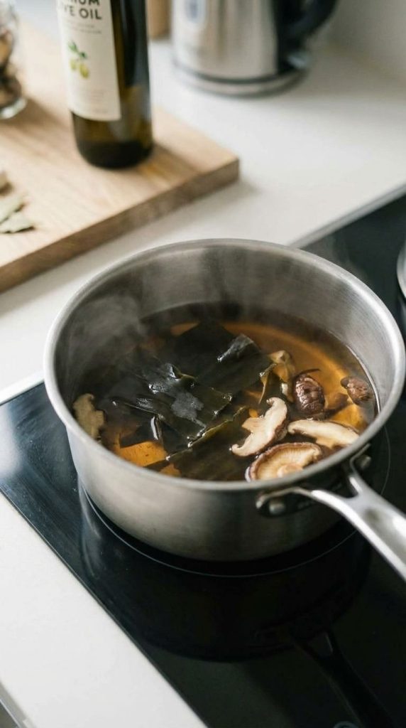 **提前准备(Prep Time - 不计入Cook Time):** 制作威士忌昆布香菇浓缩液:将10g昆布和5g干香菇片用100ml纯净水浸泡30分钟后,小火熬煮20分钟至浓缩至30ml。过滤取汁,加入10ml威士忌,冷却至室温(约25°C)。然后与0.5g海藻酸钠混合均匀,冷藏静置至少4小时(或过夜),以确保充分水合和脱泡。