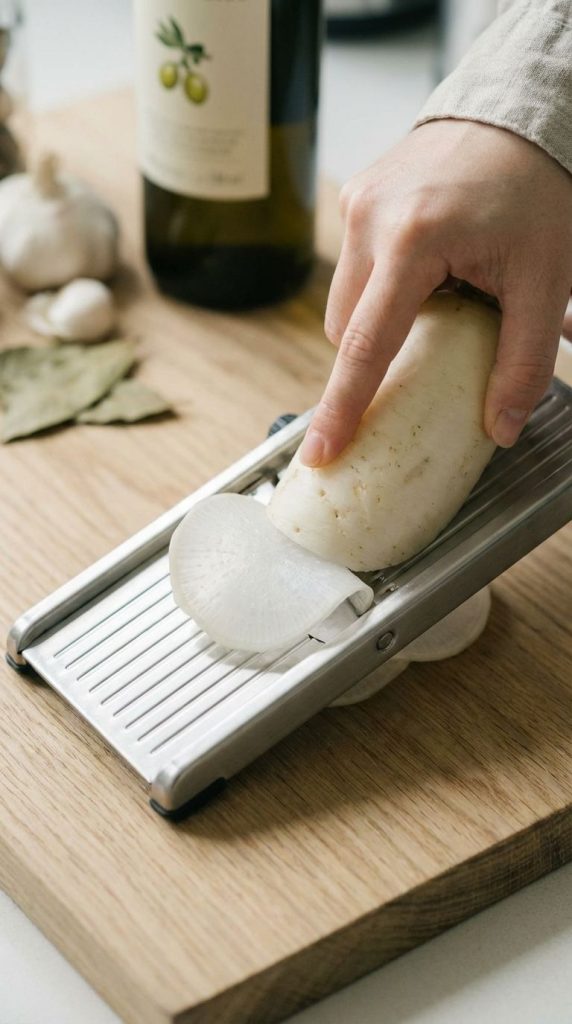 **白萝卜“筷子极速浸淬”(8分钟):** 将200g白萝卜削成约0.5mm极薄透明长片。小深锅中加入200ml特级初榨橄榄油、2瓣轻拍大蒜、1片月桂叶,中高火加热至约140°C。用竹筷夹取2-3片萝卜薄片,浸入热油1-2秒,迅速提起沥干油滴,重复3-4次,直至萝卜片半透明、极度柔韧。其中20g立即放入冰水中浸泡30秒,取出吸干水分,切细碎丁备用。剩余萝卜片平铺于温热盘中,保持微温。保留油淬油。