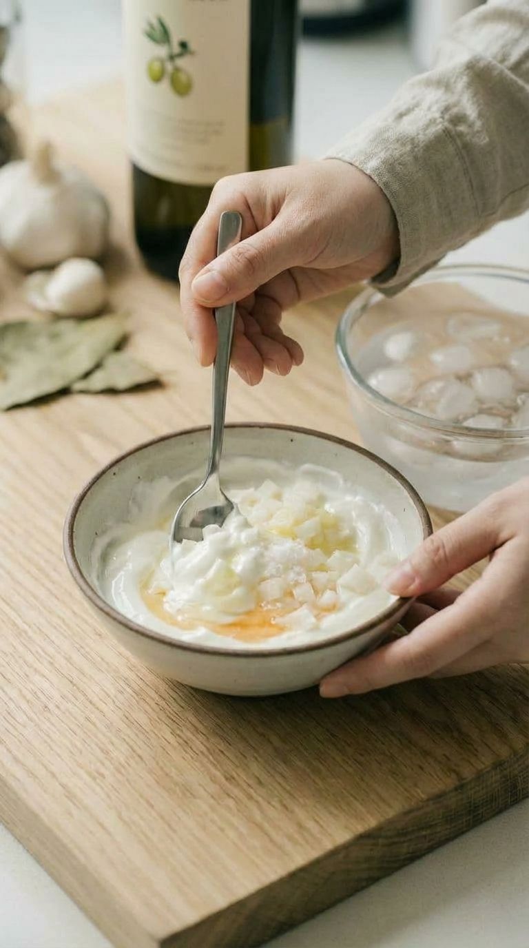 **制作劳勃尼酸奶花露基底(3分钟):** 将100g劳勃尼酸奶、20g冰镇切碎萝卜丁、5ml鲜榨柠檬汁、2g海盐和3ml橙花水混合。用勺子充分搅拌或手持搅拌棒搅打30秒至顺滑,形成蘸料基底。