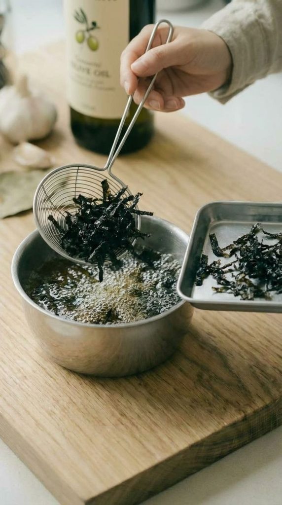 **酥脆海苔“烟火速脆”与香气元素(8分钟):** 将5g干海苔片剪成约1x2cm细丝。小深锅中加热约50ml步骤2保留的油淬油(或确保油深至少2cm)至约180°C。将海苔丝置于细密漏勺中,迅速沉入热油3秒内晃动提起,让热油滑落。迅速将炸好的海苔丝平铺在冷的金属盘或陶瓷盘上,用风扇或自然风快速冷却1分钟至极致酥脆。将10g开心果仁平底锅小火烘烤2分钟至香,取出切碎。取10ml冷却的油淬油,加入3片新鲜茴香花瓣,微波炉加热10秒(或隔水加热)出香,制成茴香花油。