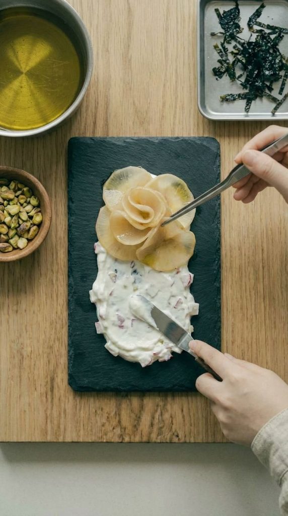 **摆盘与动态呈现(5分钟):** 在深色磨砂石板餐盘中央,抹约20-30g劳勃尼酸奶花露基底,形成不规则“建筑结构”。将微温油淬萝卜片卷曲堆叠其上,营造层次感。放置3-5颗“海雾凝露”小球。均匀撒上极致酥脆海苔丝和碎开心果。淋3-5滴茴香花油,点缀剩余的2片新鲜茴香花瓣。