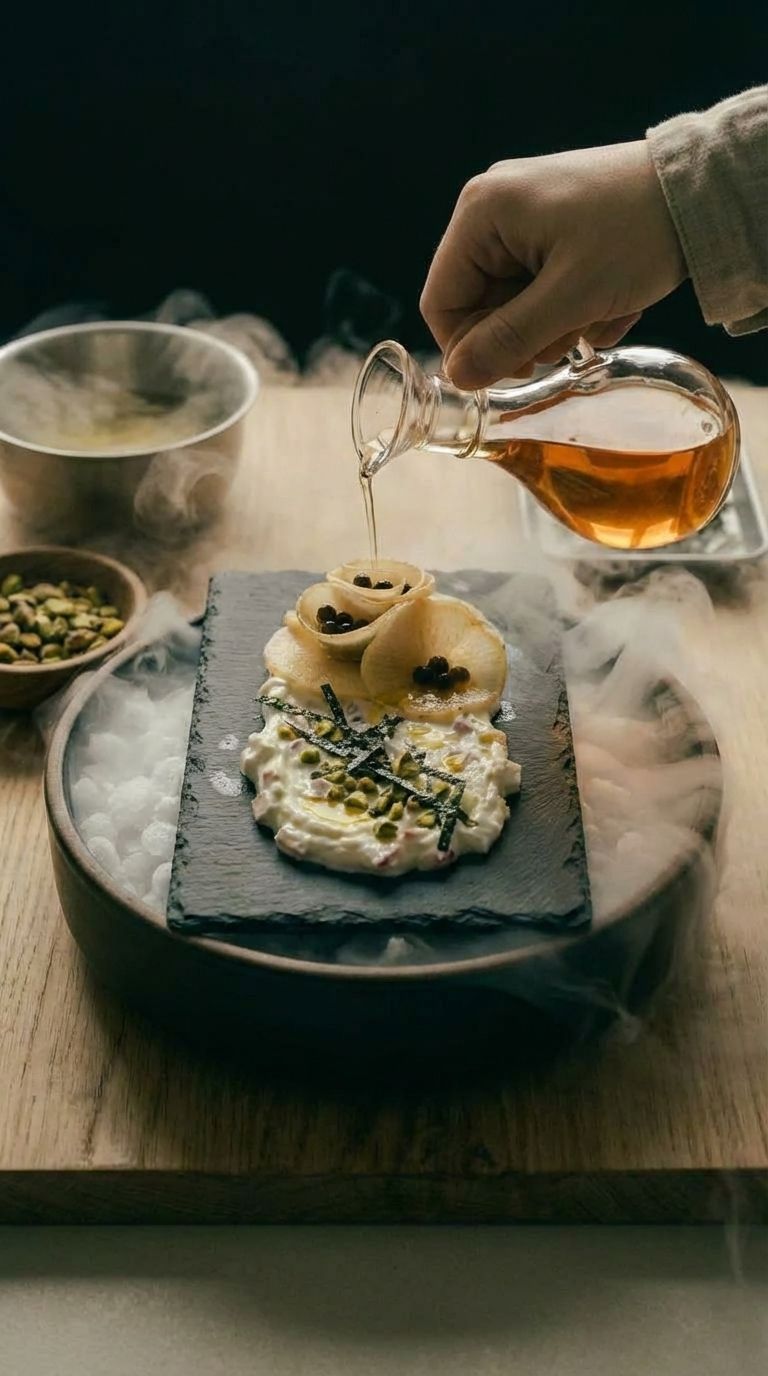 《拂晓萝卜:威士忌海雾凝露伴烟波菌香》是一道超越想象的米其林三星级创意料理,专为深夜的探寻者而生。它以看似寻常的白萝卜为核心,通过极致的烹饪魔法,将其升华为一道充满土耳其风情、低碳健康的感官盛宴。这道菜完美融合了传统油封的精髓与现代分子料理的奇幻,将食材的本味与文化叙事巧妙交织。 每一口都是对味蕾的深层探索:微温的油淬萝卜片与冰凉的威士忌昆布香菇凝露,在唇齿间激荡出冰火交织的惊喜,鲜味因谷氨酸与鸟苷酸的协同作用而几何级升华,如拂晓海雾般层层递进。劳勃尼酸奶的醇厚与橙花水的芬芳,构建起一道优雅的味觉建筑。 在视觉上,它是一幅动态的艺术品。深色石板餐盘上,萝卜片堆叠出建筑结构感,晶莹的凝露如晨曦之珠。侍者在您面前倾注温热橙花水于干冰之上,瞬间升腾的“拂晓海雾”伴随橙花幽香与低沉嘶鸣,将您带入土耳其海岸的诗意黎明。 酥脆海苔与开心果在“漏勺烟火速脆”中获得极致回味颗粒感,与威士忌的微醺完美契合。这不仅仅是一道菜,更是一场唤醒感官、穿越时空的诗意旅程,是对米其林创意精神的极致宣言。