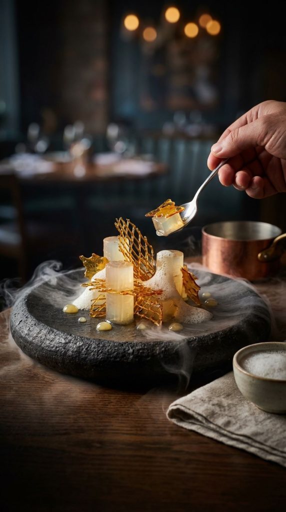 9. 组装与动态呈现 (Cook Time: 5分钟): 在深色玄武岩盘中央,将晶柱从模具中取出,以建筑学几何结构交错堆叠。旁置浪花脆片。用小号针筒精准点滴冰镇花蜜露于晶柱周围。用细长竹签蘸取冒烟花蜜露,在盘边缘快速划过,引爆香气。在盘边放置一小碟干冰,上桌时浇入少量温水,制造缥缈“海岩烟雾”。用细密茶漏和小勺,轻柔将潮汐雾霭舀入茶漏,悬空轻摇,使泡沫如雪花般洒落覆盖晶柱和盘边。
