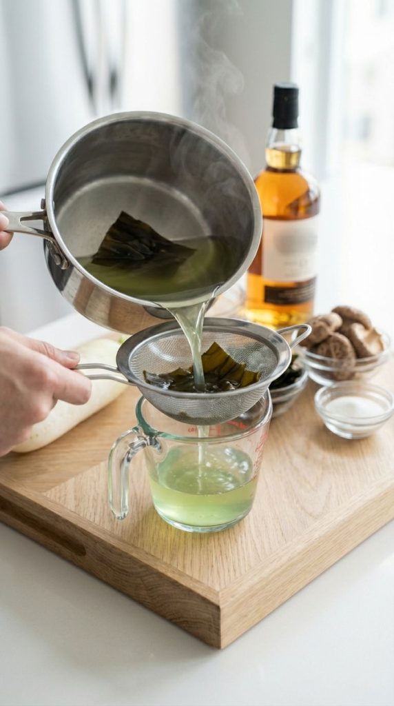 1. 海带高汤制备 (Prep Time): 5克海带冷水浸泡2小时,加热至60°C后过滤,得澄清海带高汤50毫升。
