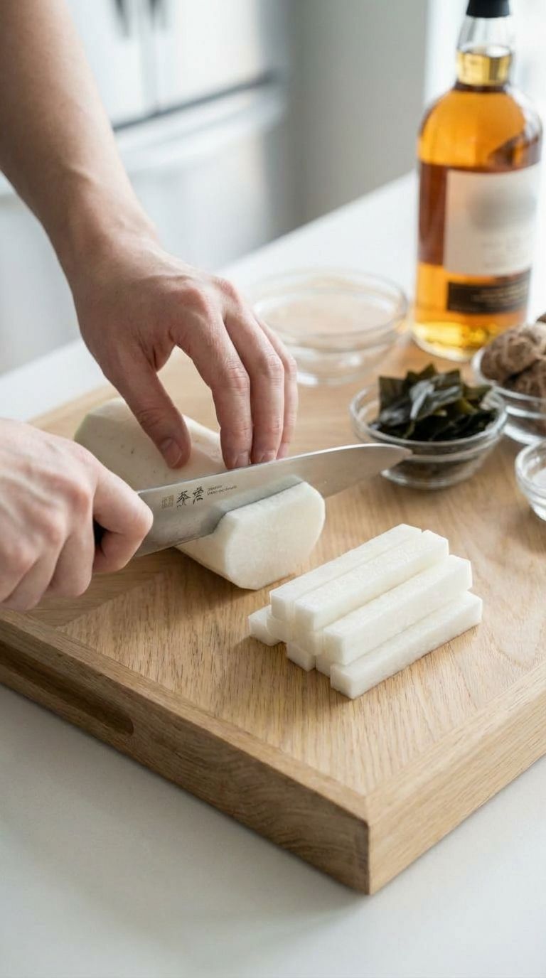 2. 萝卜晶柱压浸 (Prep Time): 白萝卜300克去皮,切成1x1x5cm长条晶柱状(约10根)。与50毫升澄清海带高汤和5毫升威士忌一同放入真空保鲜袋,抽真空密封,冷藏压浸至少30分钟。