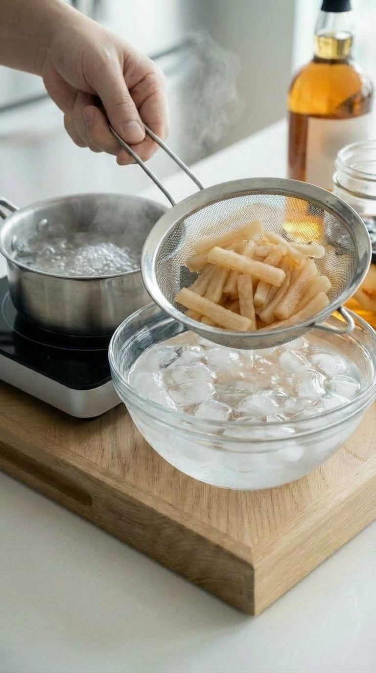 4. 极速闪焯萝卜晶柱 (Cook Time: 1分钟): 将压浸后的萝卜晶柱放入不锈钢细密漏勺,浸入沸水中闪焯30秒,立即取出沥干,放入冰水中止熟。