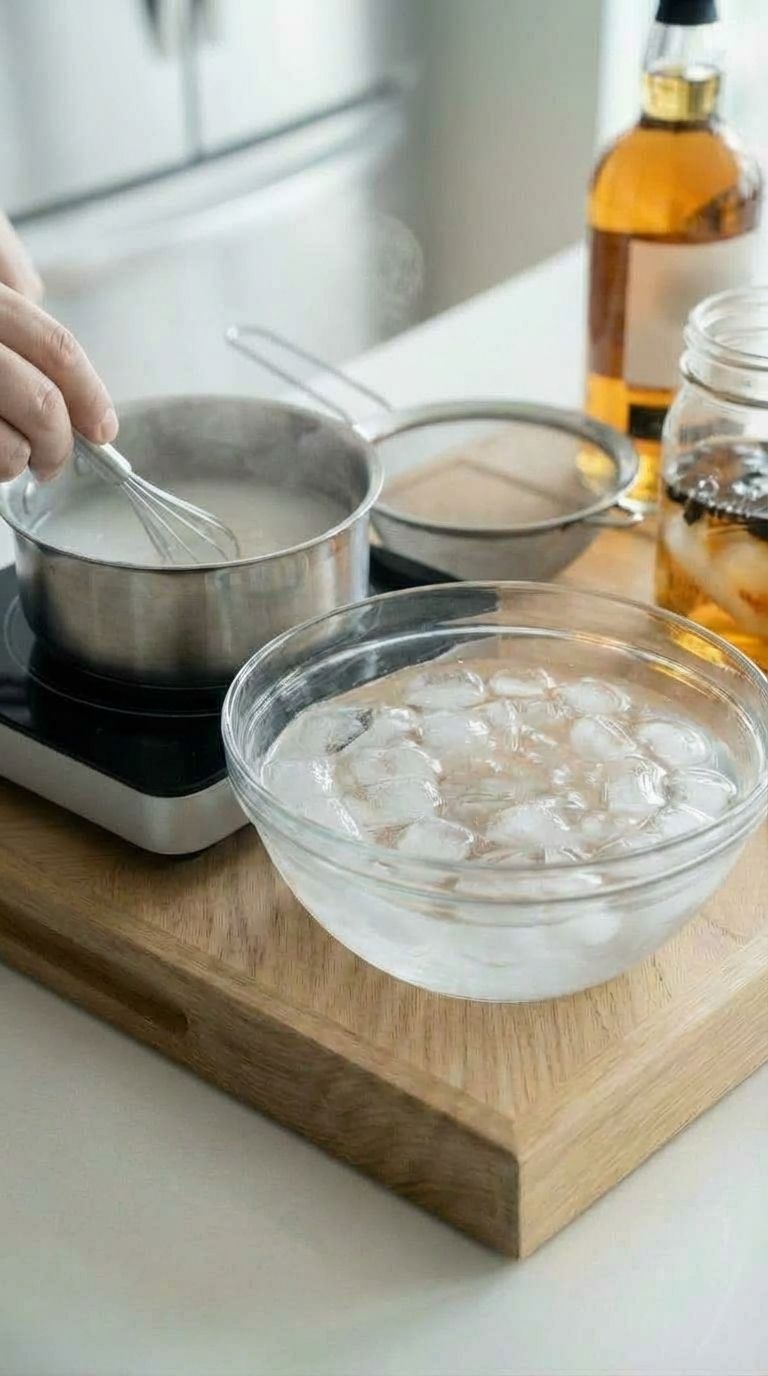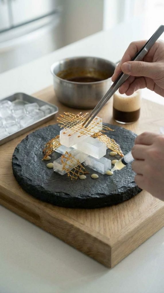 5. 晶冻液制备与超速凝固 (Cook Time: 4分钟): 萝卜汁100毫升(可用剩余萝卜边角料榨取并过滤澄清),加入1.5克琼脂粉和1克海盐。小火急速加热,持续搅拌3分钟至琼脂粉完全溶解,立即离火。将热晶冻液迅速倒入预先冰镇至零下10°C的厚底不锈钢盆,用打蛋器快速搅拌10秒形成半流动凝胶。立即用裱花袋挤入冰镇盘中搭建好的竹筷交叉网格模具中,利用冰盘极低温度使其在2分钟内瞬时固化成晶柱。