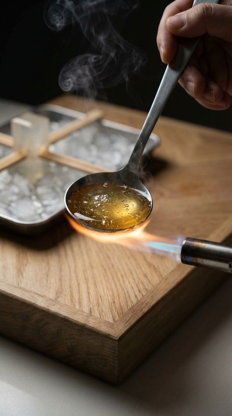 6. 洋甘菊发酵花蜜露应用 (Cook Time: 3分钟): 取预制发酵洋甘菊花蜜露30毫升,25毫升保持冰镇(2°C)。另取5毫升蜜露,倒入金属汤勺,用明火(或吹风机)迅速加热至略微冒烟(约60°C)。