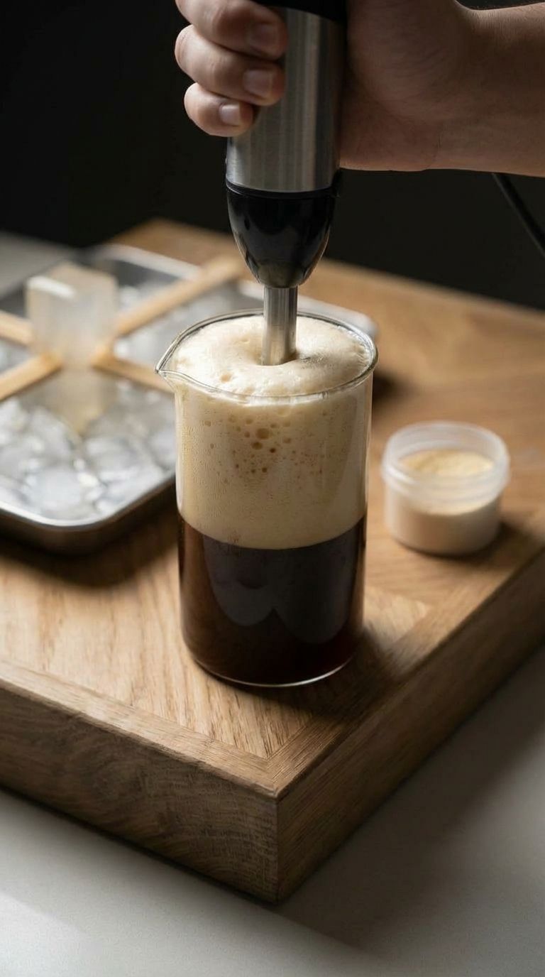 7. 海苔香菇威士忌潮汐雾霭制作 (Cook Time: 7分钟): 过滤冷萃液,得澄清液。倒入高身容器,加入1.5克大豆卵磷脂。使用手持搅拌棒,高速打发5-7分钟,直至形成稳定、轻盈且持久的泡沫状。
