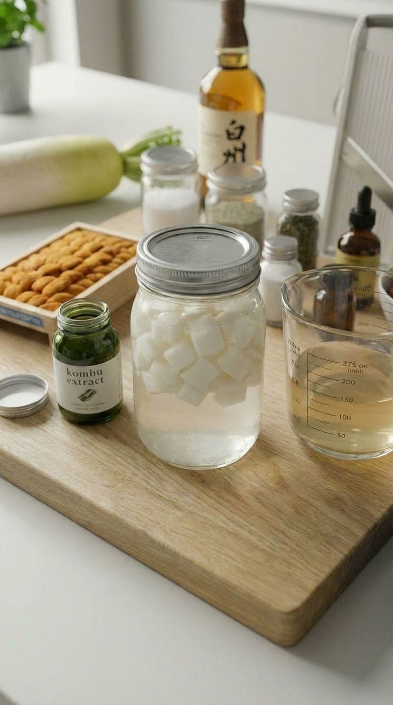 A.1. 制作昆布高汤 (活跃操作约20分钟): 将20克干昆布浸泡在500毫升冷水中30分钟。小火加热至60°C,保持10分钟,避免沸腾。取出昆布,加入5毫升昆布提取物和1克海盐,搅拌均匀。过滤后得到约450-500毫升昆布高汤,取250毫升用于后续步骤,剩余备用。