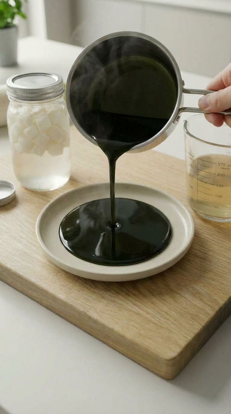 B.2. 制作深海花藻凝珠 (7分钟): 取50毫升预先冷萃好的“深海矿物化”萝卜甘露,加入1克琼脂粉、0.05毫升深海藻类芳香提取物和0.03毫升海蓝蓟花提取物。小火加热至约85-90°C,搅拌至琼脂完全溶解(约2-3分钟),离火。将溶液倒入带有极细滴管的容器中。准备一个装有100毫升冰冷的、含有5毫升昆布提取物的矿泉水(作为凝固浴)的浅盘。用滴管将热溶液一滴滴精准地滴入冰冷的水浴中,使其形成直径约2毫米的半透明凝珠。凝固后用细滤网轻轻捞出,沥干水分,备用。