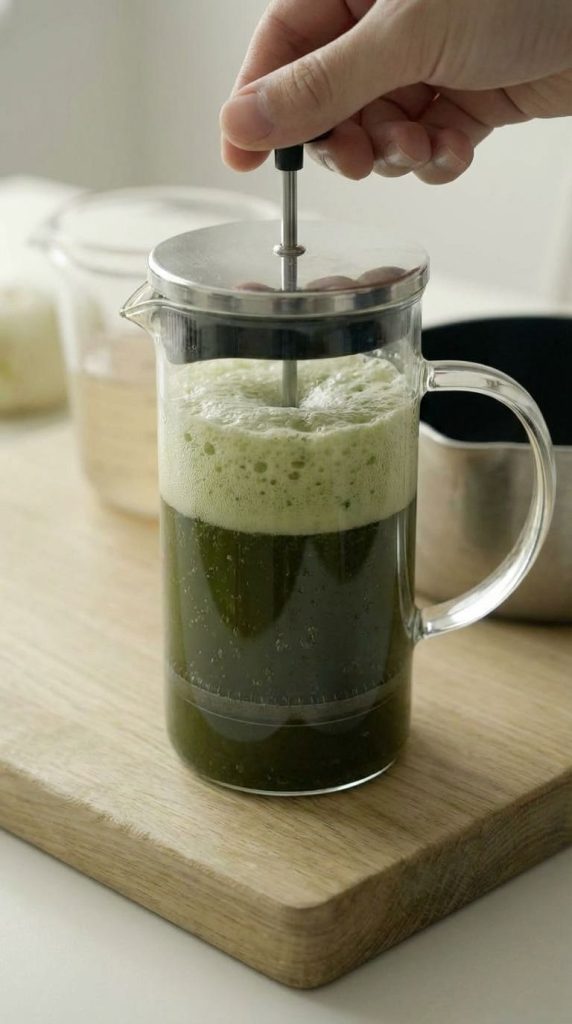B.3. 法压壶海苔分子泡沫 (5分钟): 将50毫升预先制备好的冷昆布高汤,加入2克海苔粉和0.4克大豆卵磷脂,倒入咖啡法压壶中。快速而有节奏地上下抽拉法压壶滤压杆约20-30次,直至形成稳定、细腻且轻盈的分子泡沫,备用。
