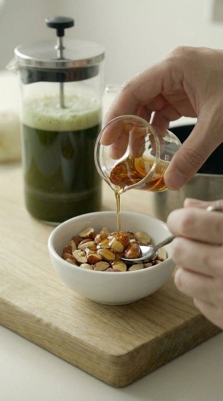B.4. 浸润威士忌杏仁碎 (3分钟): 将30克轻烤杏仁碎放入小碗中,均匀淋上15毫升单一麦芽威士忌。轻轻搅拌,让杏仁碎充分吸收威士忌的香气,备用。