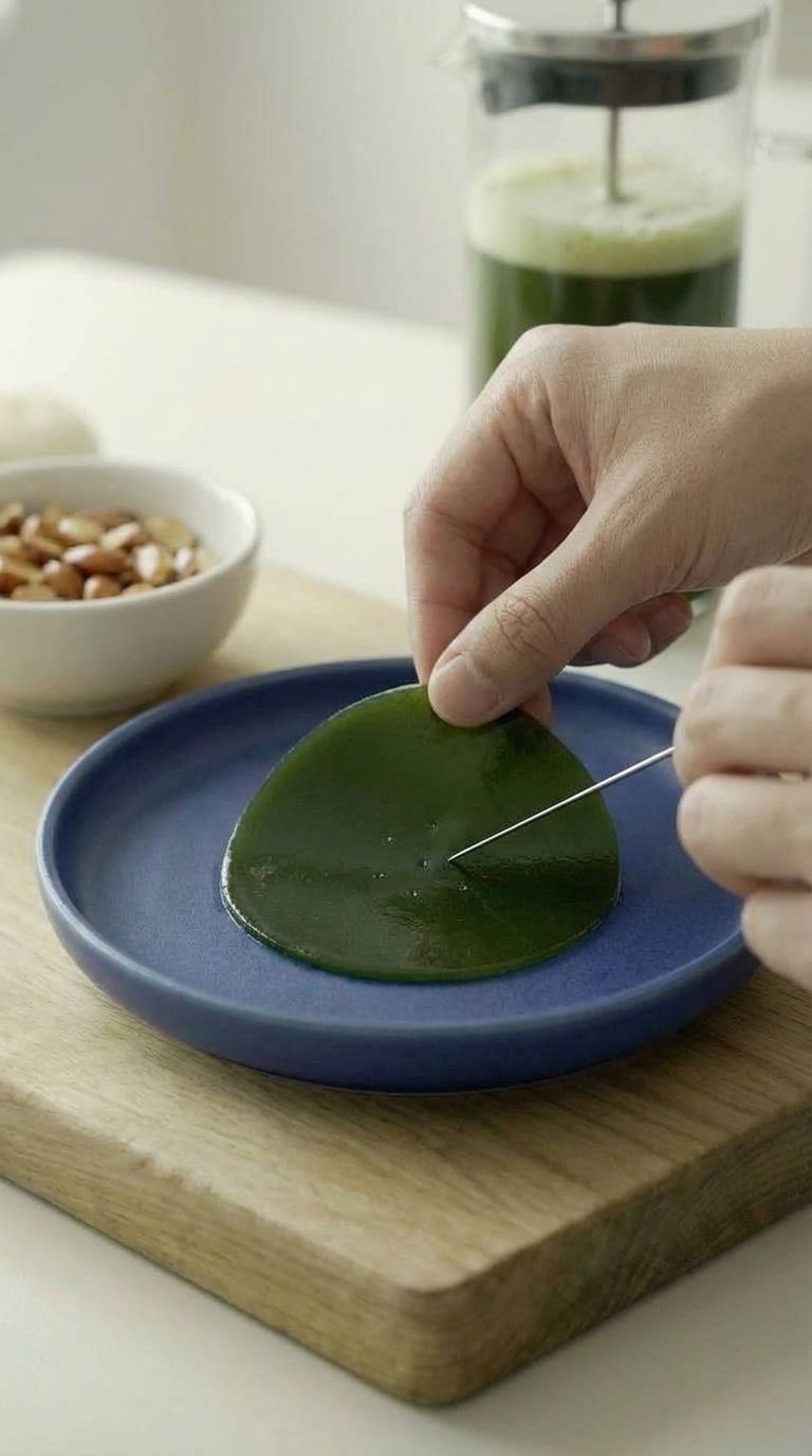 A.3. 制作隐藏深海香气凝胶片 (约15分钟): 将20毫升裙带菜提取物、1克海苔粉和0.5克琼脂粉混合。小火加热至约85-90°C,搅拌至琼脂完全溶解(约2-3分钟)。倒入一个极浅的平盘中,使其形成约1毫米厚的薄片。放入冰箱冷藏10分钟至完全凝固。凝固后,用模具或小刀切成直径约5厘米的圆形薄片,备用。