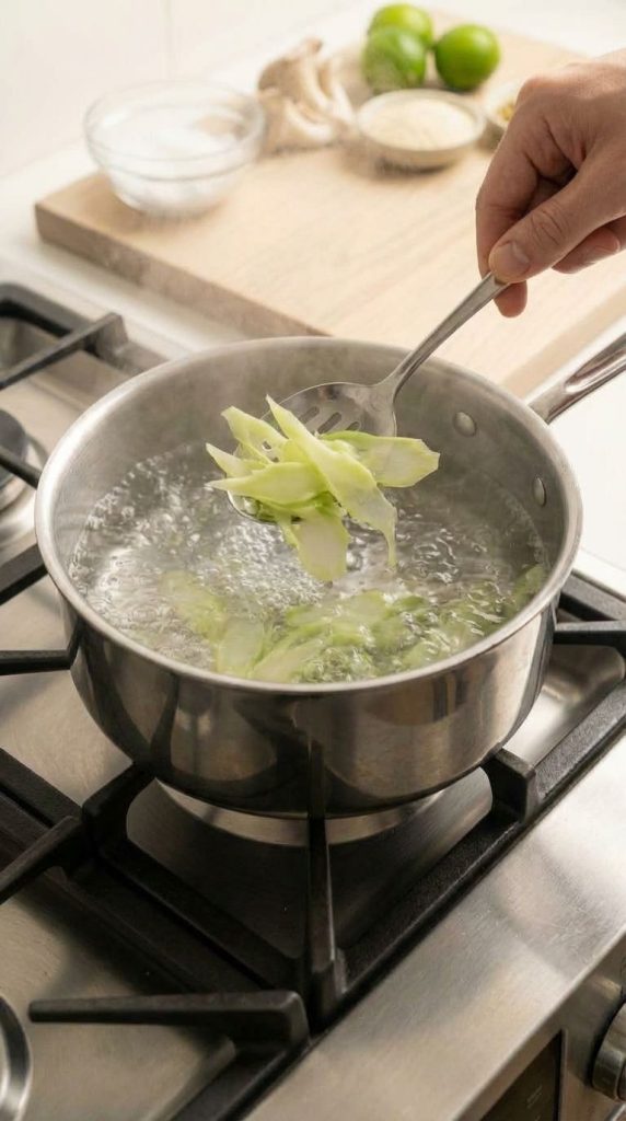 取50g西兰花嫩茎心和内部小花蕾,切成0.2cm的薄片或0.5cm见方的小块。沸水轻焯30秒后迅速捞出。立即投入预先准备好的“高浓度盐水冰浴”中(将200g冰块、200ml水和30g海盐混合)。用筷子在盐水中轻柔拨动并按压西兰花片数次,浸泡1分钟后捞出,沥干水分备用。