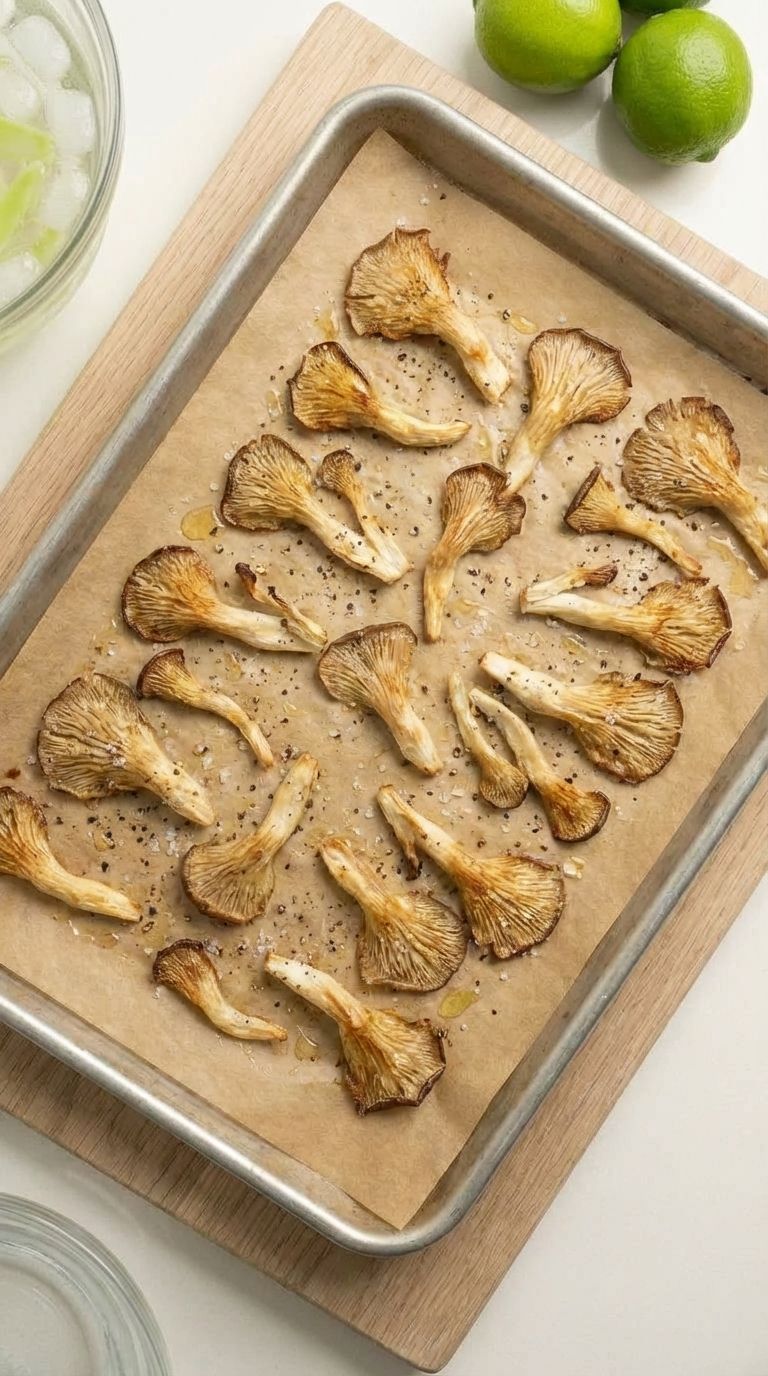 将50g蚝菇切成0.2cm薄片,平铺在铺有烘焙纸的烤盘上。喷洒5ml椰子油,撒上2g海盐和1g黑胡椒。放入预热至220°C的烤箱中层,烤制8-10分钟,直至酥脆金黄。在烤蚝菇的同时,取一厚底炒锅或铸铁锅,底部铺一层锡纸。在锡纸上放入5g茶叶、10g大米、3粒小豆蔻和2g干橘皮(或切碎的青柠叶)。燃气灶火焰仅覆盖锅底中央的最小火加热1分钟,直至锅内冒出浓烟。将烤好的蚝菇脆片放在锅内的蒸架上(确保不接触烟熏料),迅速盖紧锅盖。关火,利用余温烟熏1分钟。取出脆片备用。