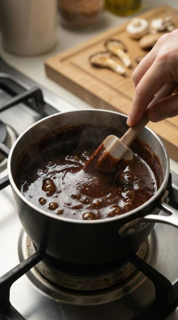 将22g去核椰枣与9ml热水放入高速搅拌机中,搅打1分钟,制成细腻的椰枣泥。在一个小锅中,混合制成的椰枣泥(约30g),15ml鱼露,10ml青柠汁,5g切碎的香茅末,3g切碎的南姜末,2g研磨成粉的小豆蔻,2g无糖可可粉,以及1g烘干香菇粉。保持微沸状态的最小火加热,持续搅拌3-4分钟,直至釉汁浓稠且均匀。关火备用。