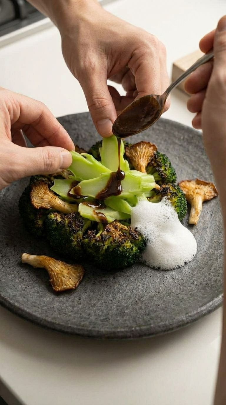 一道米其林三星级别的创意料理,以西兰花为核心,通过“烈火惊雷”焦化与“活化脆化”技法,结合茶米烟熏蚝菇和甜咸可可釉汁,呈现“灰烬里花开”的哲学意象,带来极致的味觉与感官冲突。建议搭配冰镇清酒,提升体验。Ingredients
