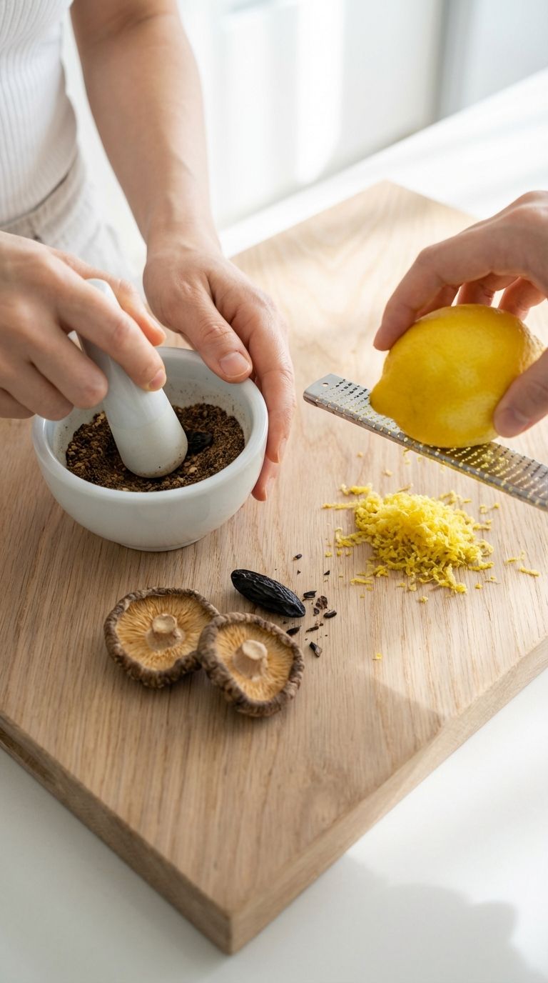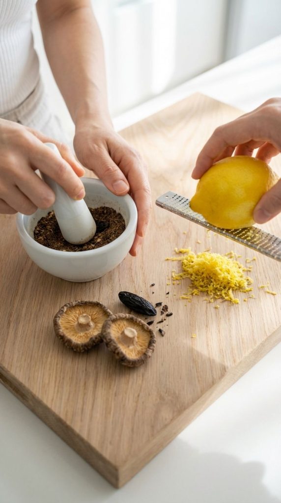 1. 【前置预处理】干香菇放入微波炉高火30秒至酥脆,与0.25颗零陵香豆分别研磨成极细粉末;用柠檬擦屑刀取雅安黄柠檬表皮屑备用。将玻璃瓶、餐叉、页岩盘放入冷冻室预冷30分钟。