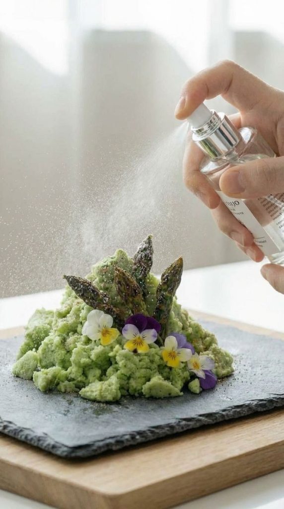 10. 【清酒雾化】将大吟酿装入食品级细雾喷壶,在距离盘面30cm处均匀喷洒2次,使微米级酒雾如晨霜般覆盖全盘,60秒内上桌。