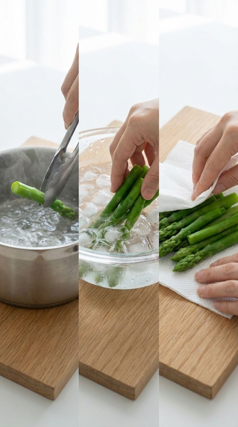 2. 【分时焯水】深煮锅沸水加入1g海盐,先入芦笋中段煮60秒,再入尖端煮30秒,捞出立即投入含有1g海盐的冰浴(150g冰块+适量冷水)极速冷却,用食品级厨房纸巾彻底吸干水分。