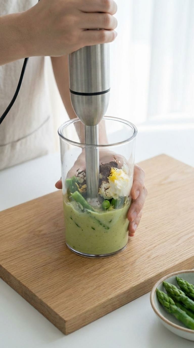 3. 【乳化过筛】将芦笋中段、马斯卡彭、零陵香豆粉、柠檬皮屑、1g香菇粉放入搅拌杯,用手持搅拌棒高速搅打45秒至细腻泥状,再用密漏物理压迫过筛三次,确保质地丝滑。