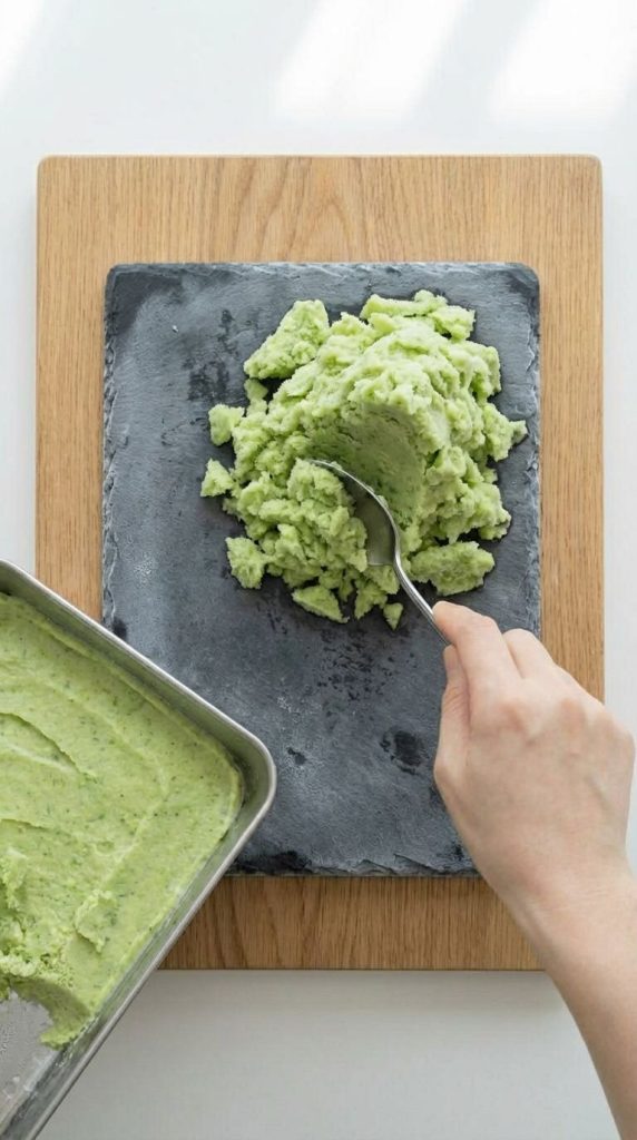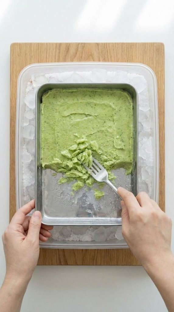 4. 【晶体冷凝】将慕斯平铺在不锈钢薄壁盆中(厚度1.5cm),置于大号冰浴盆内,加入剩余450g冰块与150g粗盐(重量比3:1)混合。静置10分钟至边缘结霜,用冷冻餐叉剔凿出碎雪状晶体。