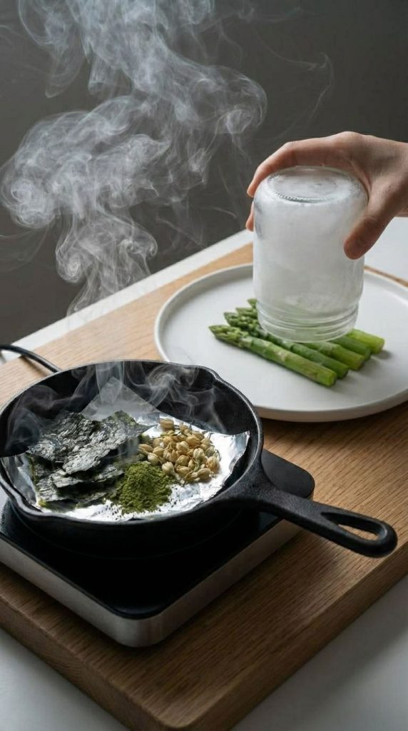 5. 【负压烟熏】将吸干水分的芦笋尖平铺在陶瓷平盘上。生铁锅内铺锡纸,撒上海苔碎、绿茶粉、茉莉花苞,大火烧至浓烟起后关火。用冷冻玻璃瓶倒扣收集烟雾,迅速覆盖在芦笋尖上并压紧边缘静置5分钟。