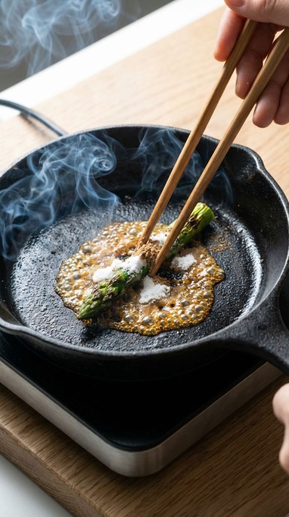 6. 【极速焦化】每根芦笋尖表面均匀拍上1g阿洛酮糖与0.5g香菇粉。生铁锅大火烧至冒青烟(约260°C),用竹筷夹芦笋尖贴紧锅底快速炙烫3-5秒,观察到糖粉转化为金棕色焦糖液并冒出浓郁甜香时立即移开。