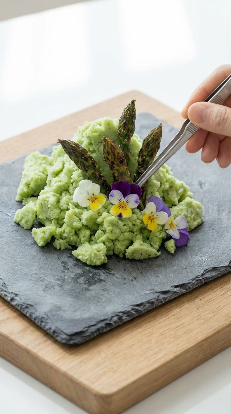 8. 【生命植入】将带火气的焦香芦笋尖错落插入雪中,并在雪堆边缘点缀新鲜三色堇,模拟破雪而出的生命感。